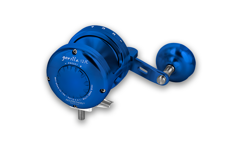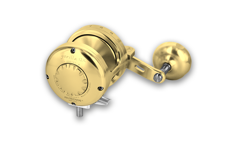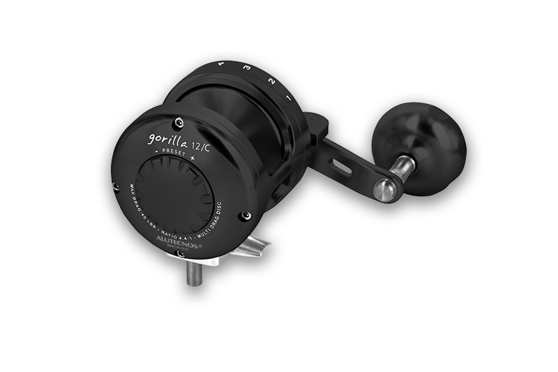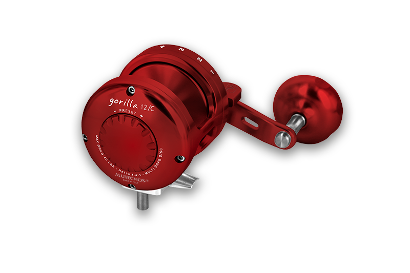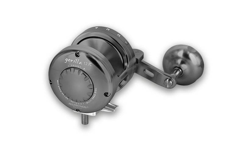 Gorilla 12C, narrower compared to the Gorilla 12, integrated drag-preset and drag side plate with ergonomic design for the utmost comfort during fishing action. Retrieve ratio 4,4:1, a longer operating lever that, combined with the aluminum power handle, allows to generate a considerable power to better exploit the “Multi Drag Disc” (which can be set over 40 lbs with guaranteed free-spool).