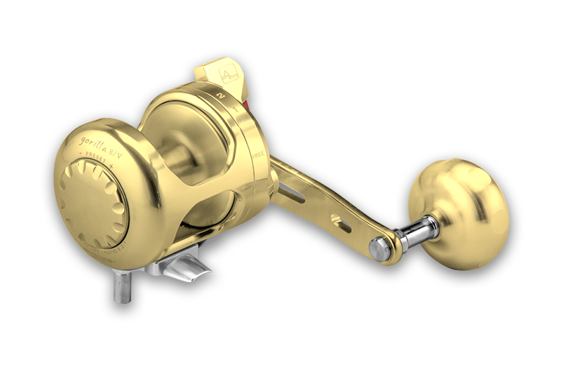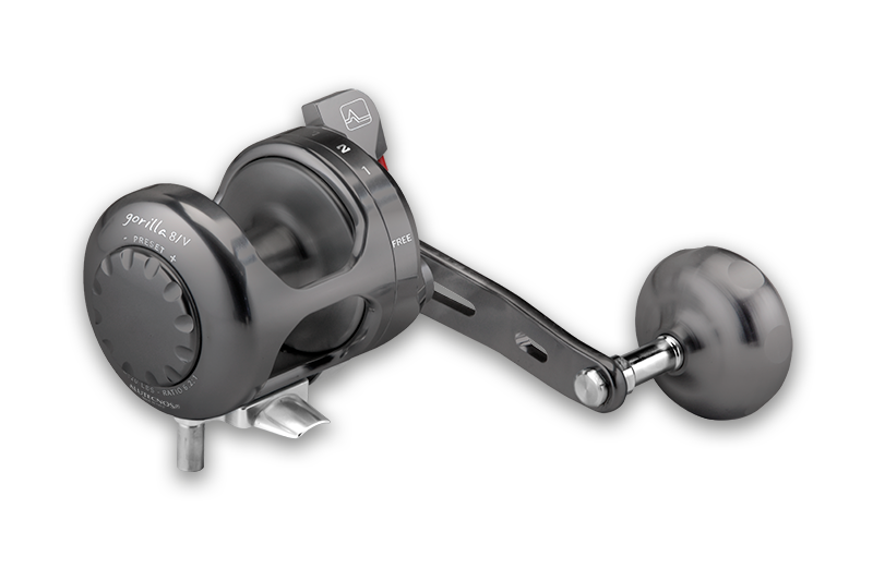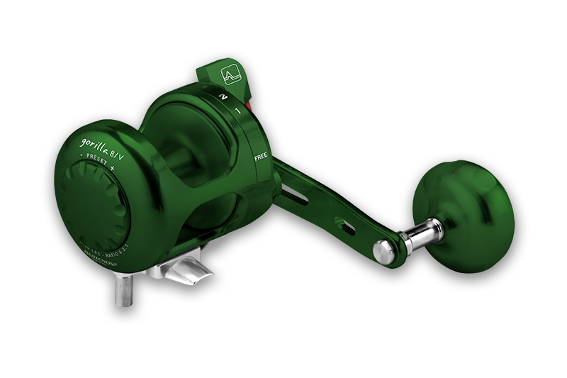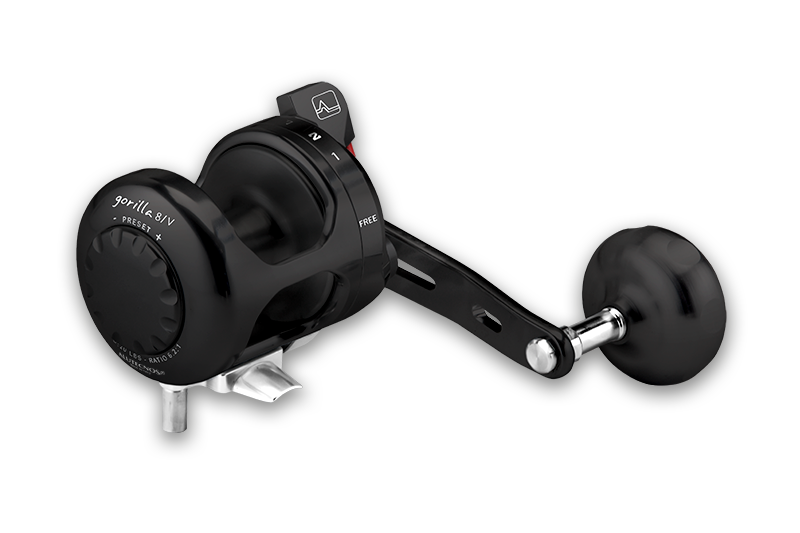 Small, compact and above all light with a fast retrieve ratio of 6,2:1 and an unmistakable look designed and studied in all details for those who love vertical jigging and not only. Gorilla 8V, integrated drag pre-set and drag side plate with ergonomic design for the utmost comfort during fishing action. Double drag disc that can be set up over 20Lbs with guaranteed free spool; a longer re-entering drive lever that, combined with the aluminum power handle, allows to generate a considerable power to better exploit the fast retrieve ratio; this makes the two speed system unnecessary and superfluous.
